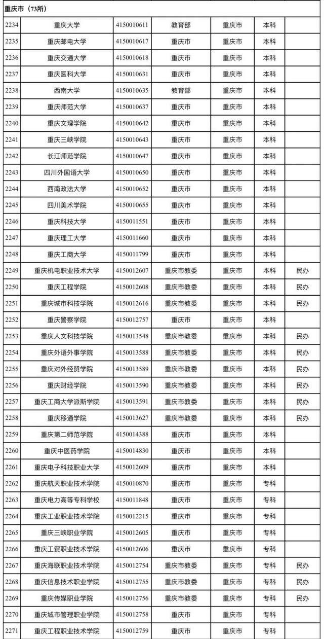 高考志愿填报在即,近日,教育部发布了全国高校名单,其中,重庆有普通高等学校73所,成人高等学校3所。