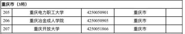 此外,重庆有3所成人高等学校,分别是:重庆电力职工大学、重庆冶金成人学院、重庆开放大学。