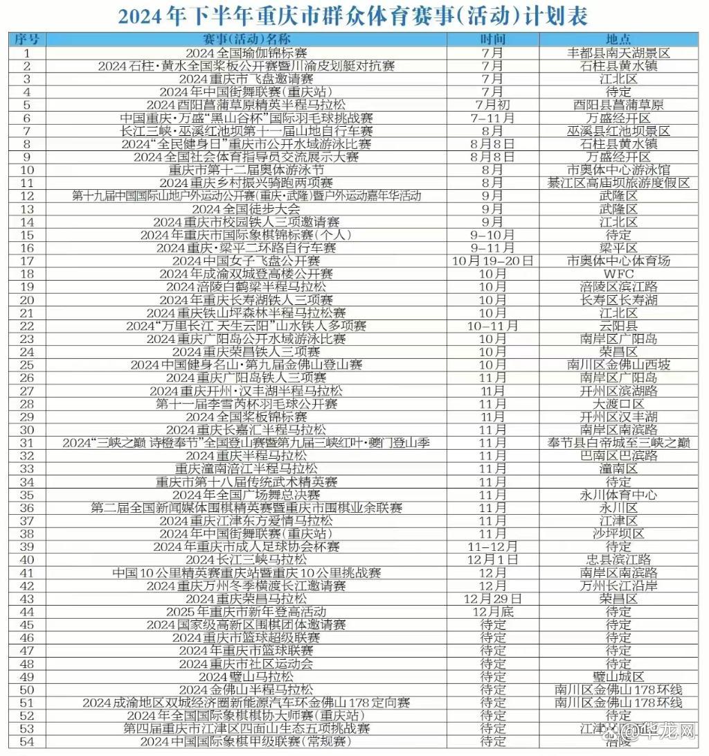 群众体育赛事(活动)计划表。重庆市体育局供图青少年体育赛事(活动)方面,各类赛事活动则多达82项,覆盖了足球、篮球、田径、乒乓球、艺术体操、跆拳道、攀岩、跳水等众多项目。同时还将举办重庆市社区亲子运动会(系列活动)、重庆市青少年航空模型锦标赛、第二届川渝青少年低空飞行(航空模型、无人机)系列赛等特色活动。