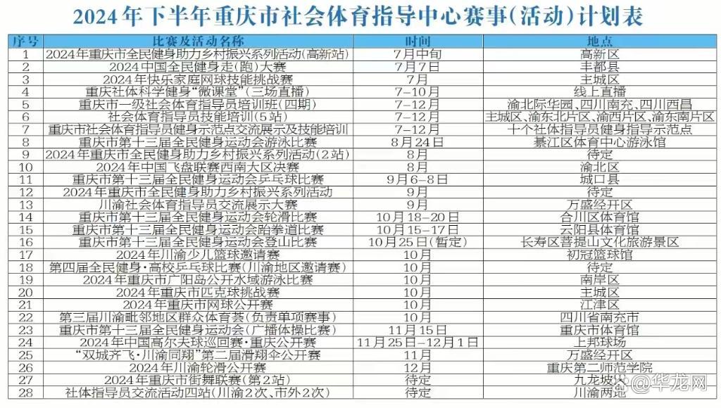 青少年体育赛事(活动)计划表。重庆市体育局供图此外,市社体中心计划开展2024中国全民健身走(跑)大赛、2024年快乐家庭网球技能挑战赛、2024年重庆市全民健身助力乡村振兴系列活动、川渝社会体育指导员交流展示大赛、2024年重庆市匹克球挑战赛等丰富新颖赛事(活动)近30场。