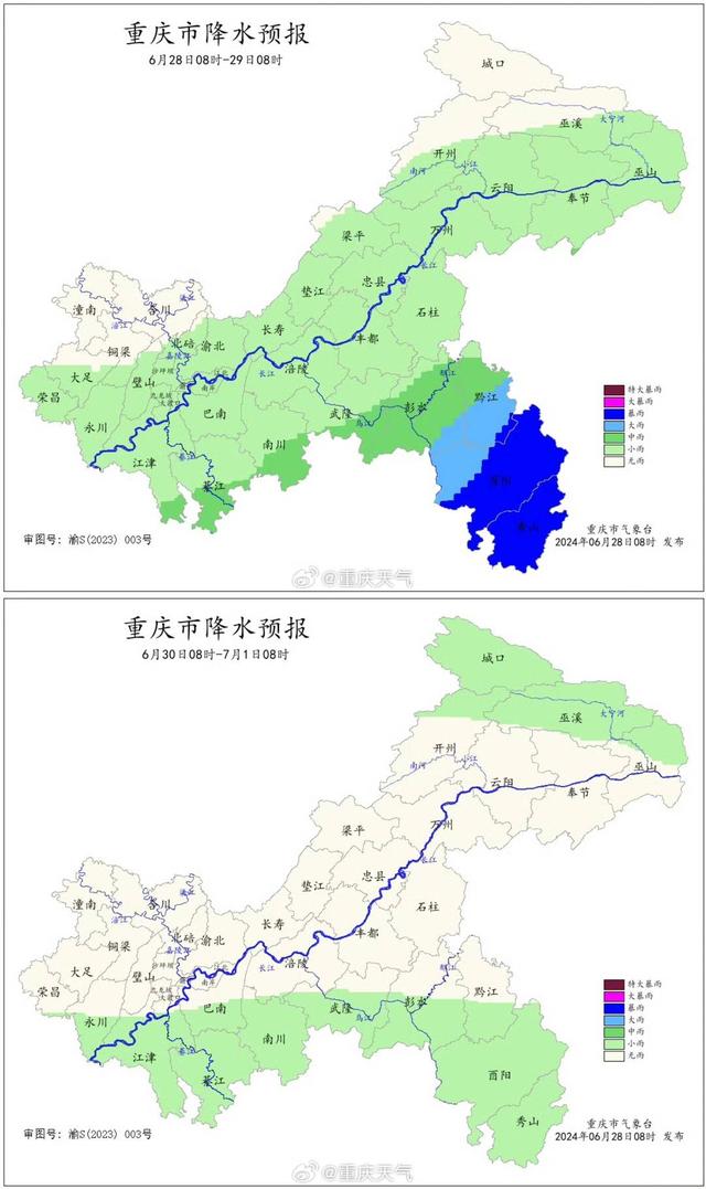 预计6月28日8时~7月1日8时,重庆市中西部和东南部部分中小河流可能出现不同程度涨水过程,部分河流可能超警,个别河流可能超保。重点关注乌江出现的过境洪水。