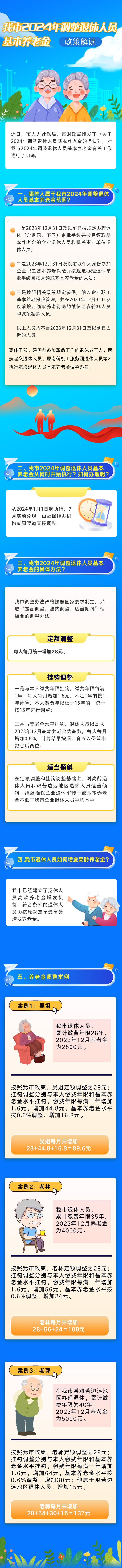 据了解,经党中央、国务院批准,从2024年1月1日起调整企业和机关事业单位退休人员基本养老金。调整范围为2023年12月31日前已按规定办理退休手续并按月领取基本养老金的退休人员(不含2023年12月31日及以前已死亡的人员)。国家要求各地以本省市2023年退休人员月人均基本养老金的3%确定调整比例和水平。我市调整办法严格按照国家要求制定,采取“定额调整、挂钩调整、适当倾斜”相结合的调整办法。