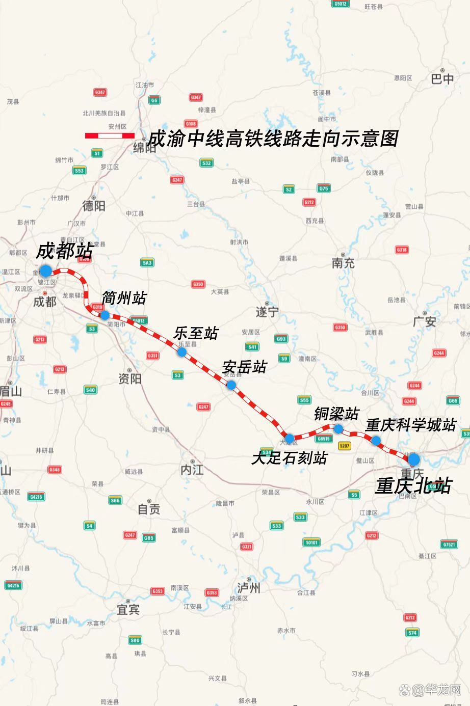 成渝中线高铁自重庆枢纽重庆北站起,向西经重庆市渝北区、沙坪坝区、璧山区、铜梁区、大足区,四川省资阳市、成都市,引入成都枢纽成都站,正线全长292公里,设计时速350公里。