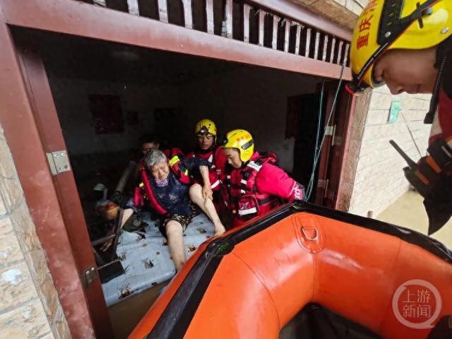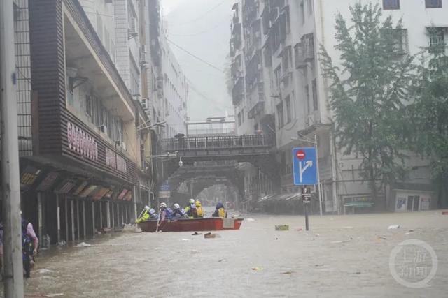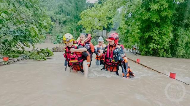 长寿受灾居民在救援人员帮助下转移。