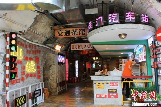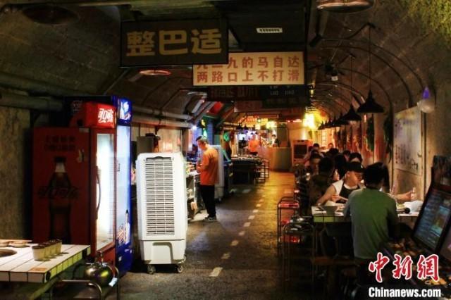 近年来,重庆不少防空洞变身休闲“打卡地”,开发出火锅店、书屋、纪念馆等多种业态,防空洞逐渐转变为多元化利用的现代城市资源。图为渝中区一防空洞内的商业。唐艺珊 摄