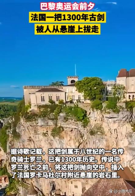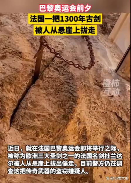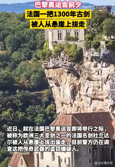 在巴黎奥运会前夕,一起震惊法国乃至全球的文物失窃案引发了广泛关注。据报道,一把具有1300年历史的古剑,被誉为欧洲三大圣剑之一的杜兰达尔,竟在光天化日之下被人从悬崖上拔走,这一事件不仅牵动了无数历史爱好者的心,也让文物保护工作再次成为公众关注的焦点。