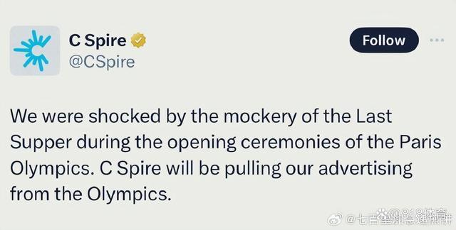与此同时,巴黎奥运会赞助商跑路了!巴黎奥运会赞助商之一、美国科技公司C Spire在社交媒体上宣布,因为开幕式对基督教和宗教的不尊重(提及了最后的晚餐),将撤出自己在奥运会期间的所有广告。
