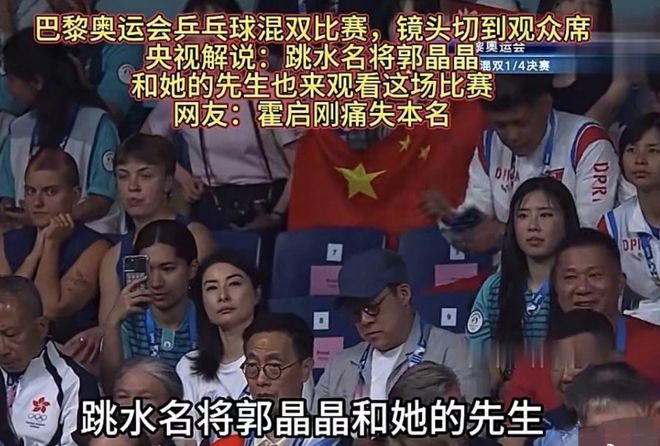 在乒乓球混双半决赛举行的时候,郭晶晶和霍启刚也被直播镜头拍到,当时解说员说了一句“跳水名将郭晶晶和她的先生”,网友纷纷调侃霍启刚痛失姓名。也能看出郭晶晶在“娘家”的地位。